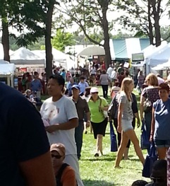 What's especially cool about the C of C event layout is that booths are set up in blocks of four with a 10ft. space in between each quad, so everyone has a corner booth. And all of the booths are in the middle of the street. That doesn't leave room for any storage behind the booths, however. The other show, which is sponsored by Eastern Shore Art Center, sets its booths up side-by-side on opposite sides of the street with tents backed up along each curb. The shows are adjacent to each other, so the only way to tell you've moved from one show to the other is by noticing the booth layout.